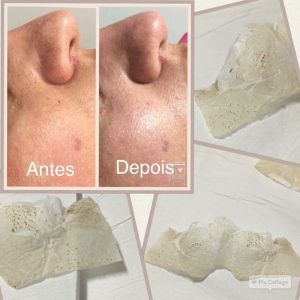 • Aplique sobre o local desejado, coloque as tiras de papel e por cima e reaplique a máscara. A aplicação deve ser em partes: 1º Nariz, 2º Testa 3º Queixo, 4º Laterais e áreas faltantes.